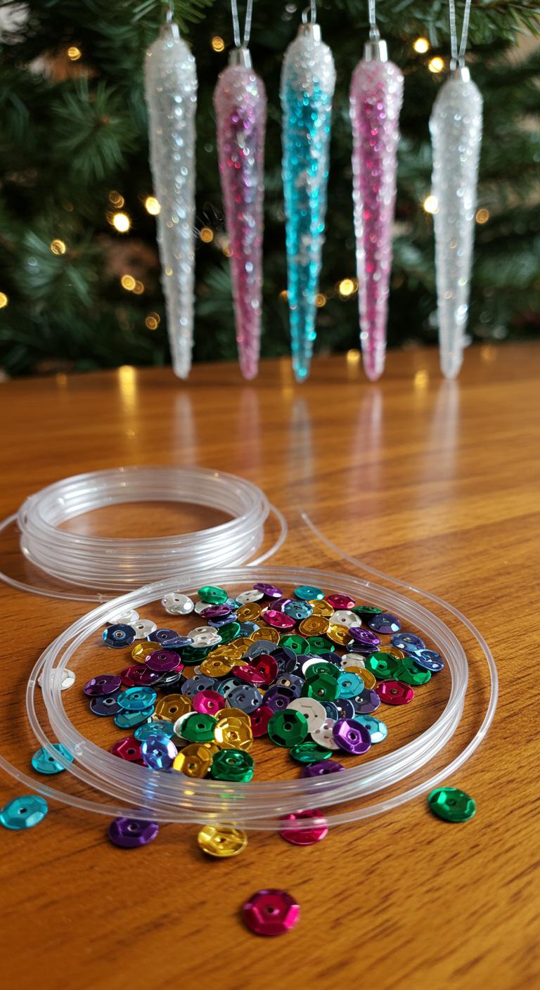 Gather a handful of sequins, beads, and clear fishing line, and you’ll turn ordinary supplies into sparkling icicle ornaments in minutes. Thread a loop, then string sequins using varied sequin color combinations and bead size variations for depth. Knot between sections to fix shapes, trim excess line, and hang. You’ll enjoy a free, airy vibe that glints on the tree.