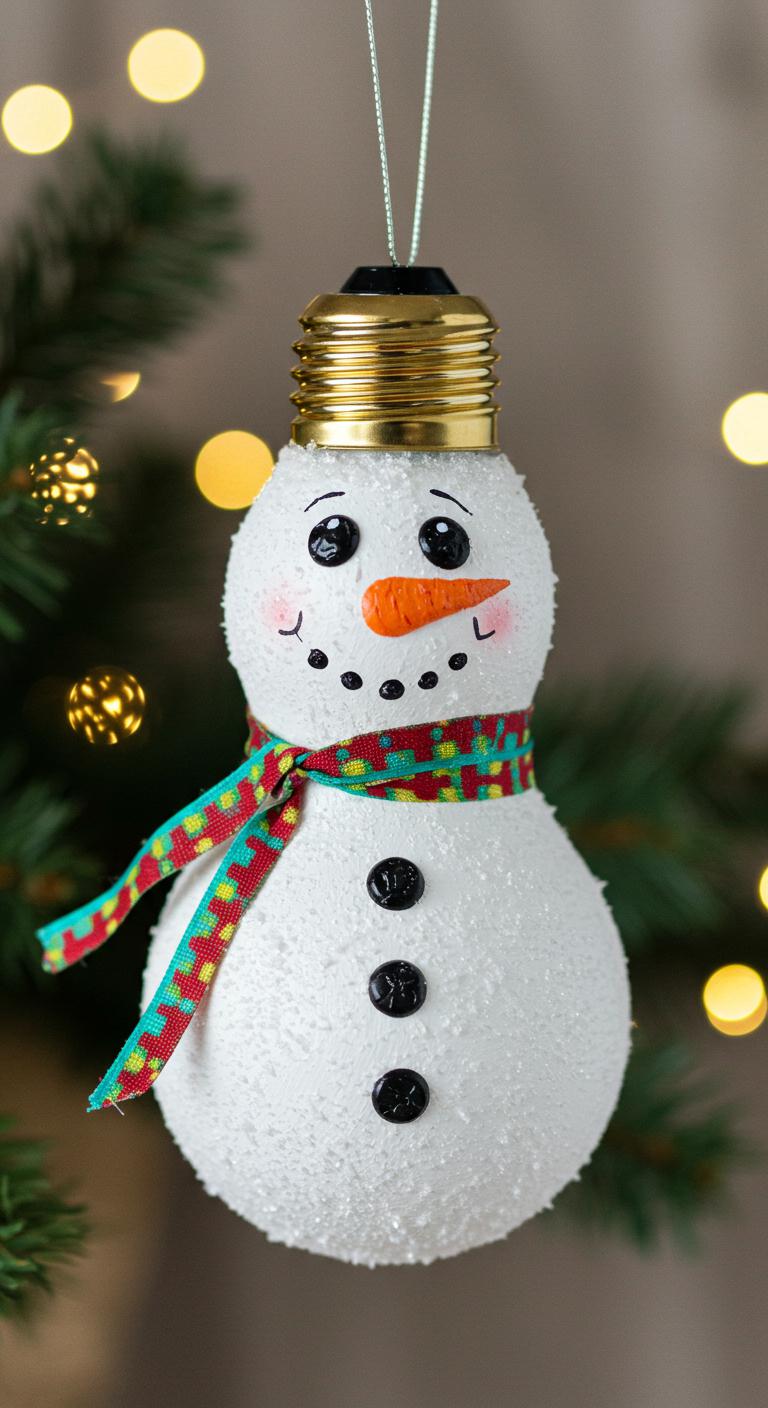 First paint a frosty base on the bulb, add tiny coal eyes and a carrot nose with acrylics, glue a scarf from ribbon, attach a loop for hanging — your tiny snowman decoration is ready.