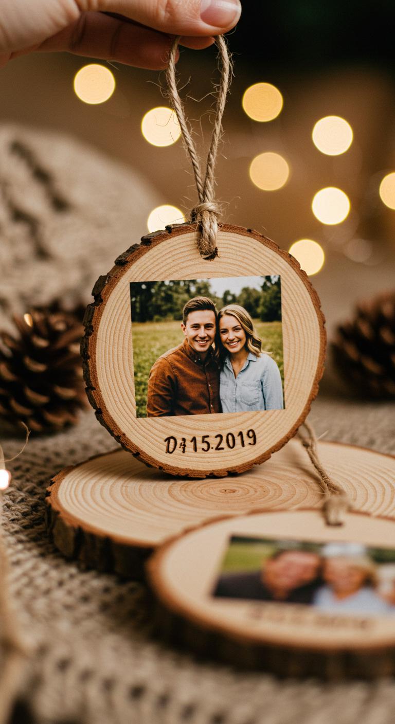 Warm wood and a favorite photo make a wooden slice photo ornament quick to assemble and impossible not to love. You pick a slice, sand and seal it, trim your photo to fit, and glue it centered. Punch a hole, add twine for hanging, and stamp a date or name for wooden slice personalization. Hang it for a cozy photo ornament display.
