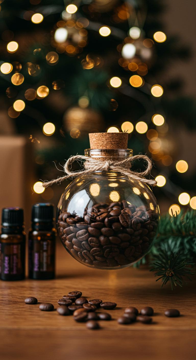 Grab a handful of whole coffee beans and a clear glass ornament to make a simple, fragrant decoration that fills the room with warm aroma; you’ll love how the dark beans look against twinkling lights. Pour beans in, add a few drops of essential oil, cork or cap, and tie twine. Enjoy coffee aroma benefits while hanging it—easy festive decorating tips for a free-spirited tree.