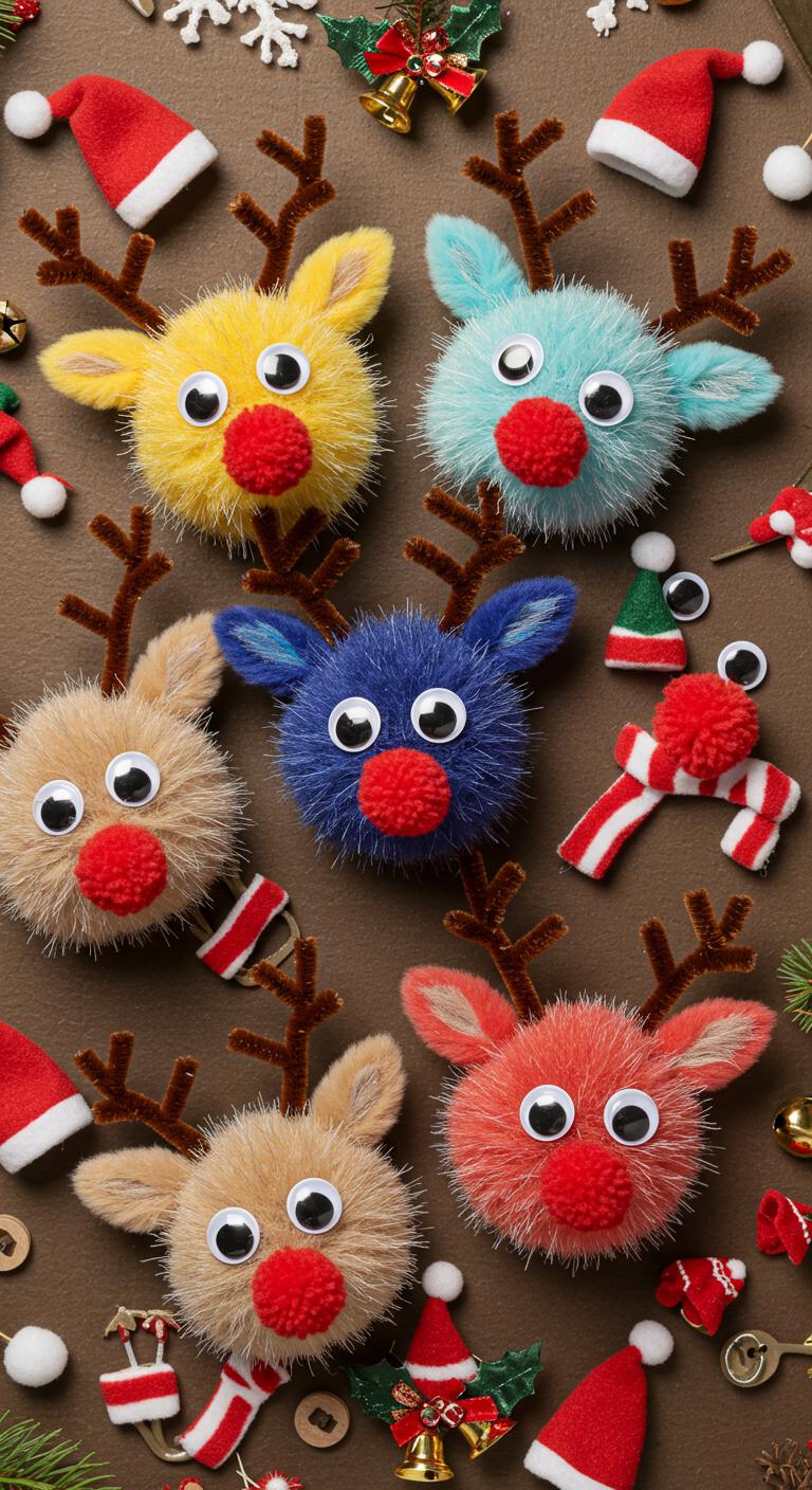 If you loved the cozy scent and simple assembly of the coffee bean ornament, you’ll enjoy making pom-pom reindeer heads next — they’re quick, playful, and great for kids. Pick pom pom colors, make a fluffy base, glue on googly eyes and a red nose. Twist pipe cleaner antlers, add ribbon loop, then personalize with tiny reindeer accessories for a free, festive look.