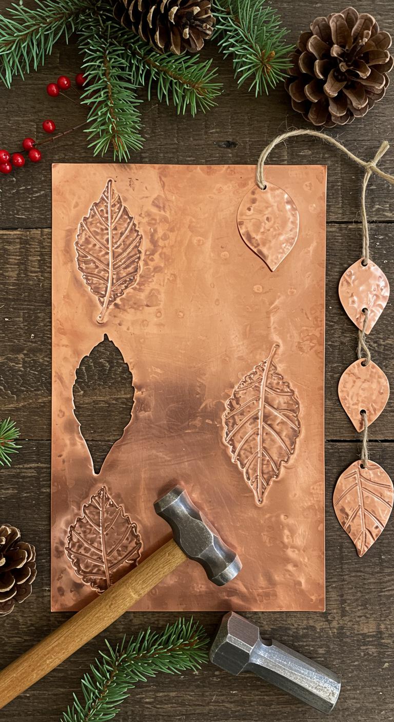 Start by picking a sturdy copper sheet or a blank copper pendant you can cut and punch a hole in for hanging; you’ll be hammering leaf textures into it and you want metal that bends without cracking. Trace a leaf, cut, then use copper stamping techniques and ball-peen hammers to imprint veins. Polish, patina if desired, add twine for festive ornament customization and hang.