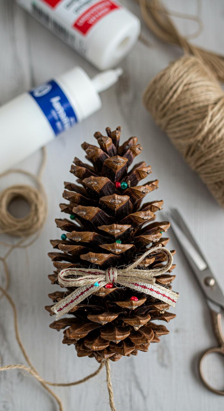 You pick a pinecone, trim loose bits, then wrap twine using twine crafting tips for a neat loop.