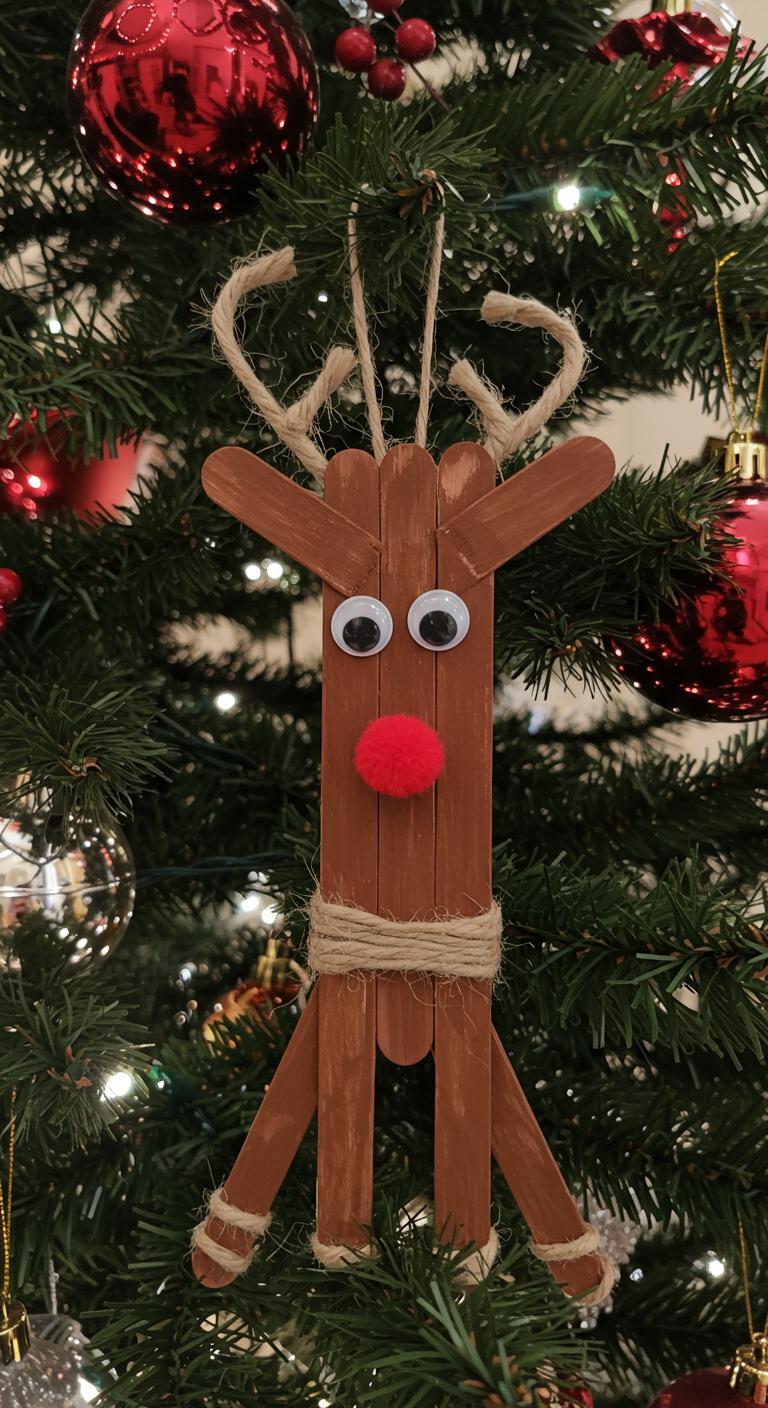 Make a cute reindeer ornament using just popsicle sticks, paint, and a few simple embellishments to bring a handmade touch to your tree.