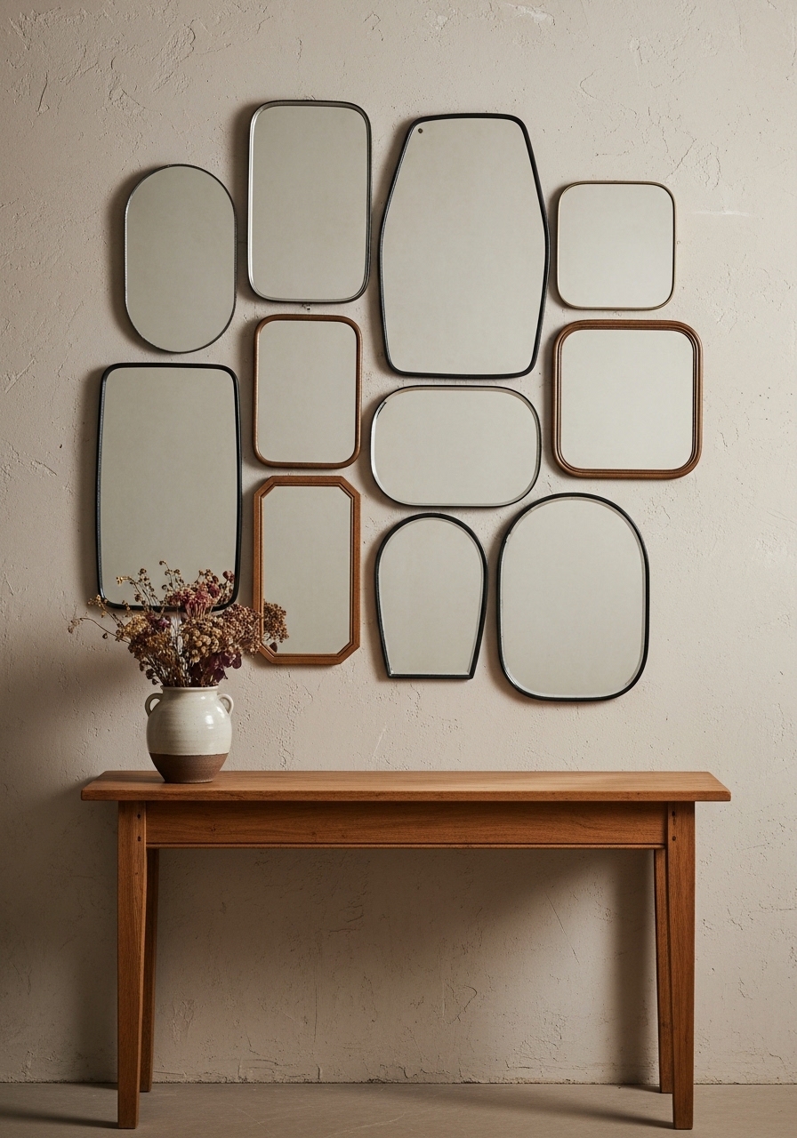 Gather mismatched mirrors from yard sales and hang them as a gallery to reflect light and add vintage farmhouse flair. It’s inexpensive and makes rooms look bigger. I hung a set in my hallway, and it brightened everything up; plus, it’s a fun weekend project with zero regrets.