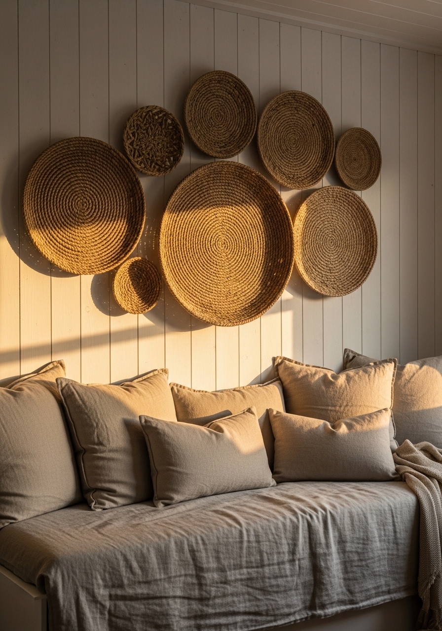 Hang inexpensive woven baskets as wall art to add texture and storage in a hallway or bedroom – it’s a fresh take on farmhouse decor. Source them from markets. This setup in my home adds warmth and hides small items; it’s practical, pretty, and super cheap to pull off.
