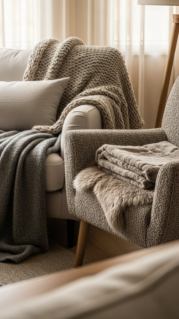 Layer linen, wool, and faux fur for texture; tuck a throw over a plush ottoman and drape another across a boucle chair.