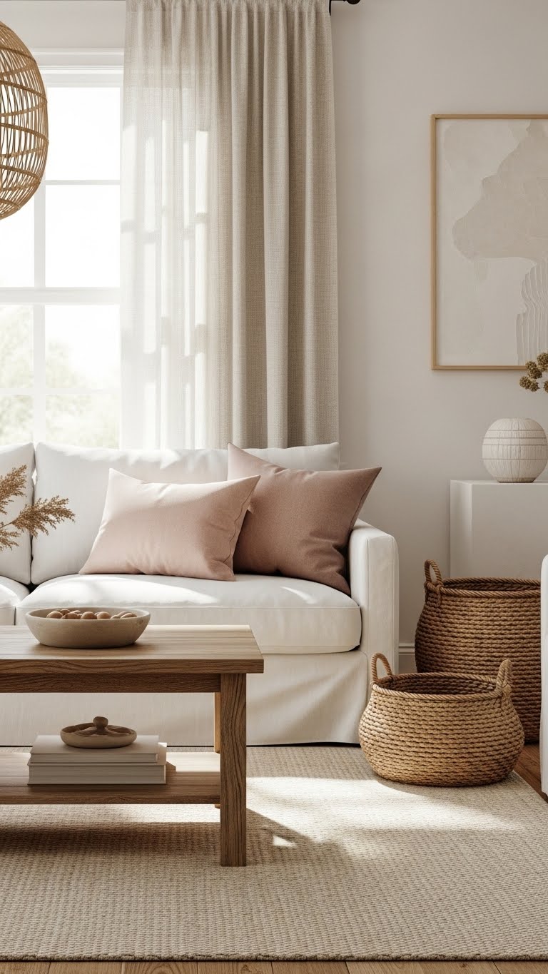 You’ll lean on natural textures — linen, woven baskets, grainy wood — to create depth and muted contrasts. Keep surfaces uncluttered so pieces breathe; freedom feels tidy, tactile, intentional.