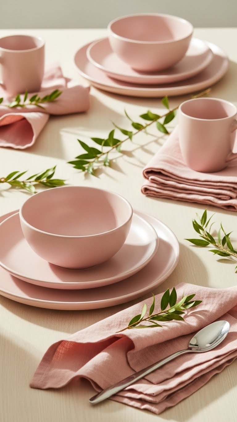 Start by introducing a few pale pink pieces—dinner plates, a matte cereal bowl, or a soft linen napkin—to let that gentle hue ripple through the room without shouting. You’ll mix pastel place settings with creamy wood and tossed greenery, set a small stack of blush napkins beside mugs, and let soft textiles and curved dishes create an effortless, free-spirited cozy vibe.