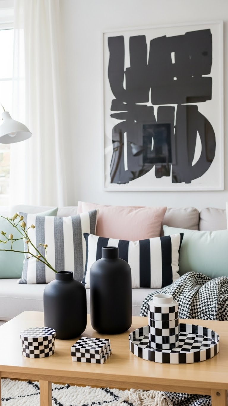 Lean into black-and-white pieces to anchor your pastel palette and give the room a chic, grounded contrast. You’ll layer graphic neutrals—striped pillows, matte vases, bold art—to keep things fresh without feeling heavy.