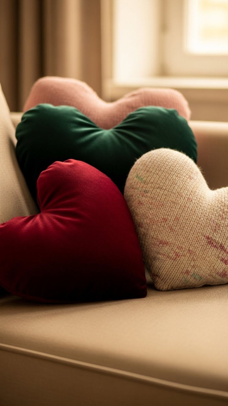 Mix velvet hearts for luxe depth with knitted hearts for handcrafted charm, arranging a couple casually so your space feels free, warm, and ready for slow, unhurried moments.