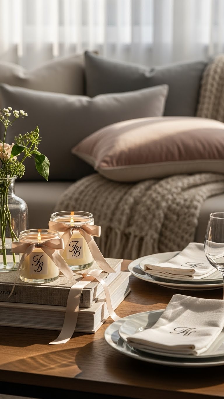 After you’ve layered soft throws and textured cushions, bring in small, polished details that read intimate rather than fussy. Tie satin ribbons around candle jars or glass vases for a whisper of sheen, tuck satin bookmarks into coffee-table books, and set monogrammed napkins at each place for effortless charm. These touches feel personal, simple, and free — romantic without heavy effort.