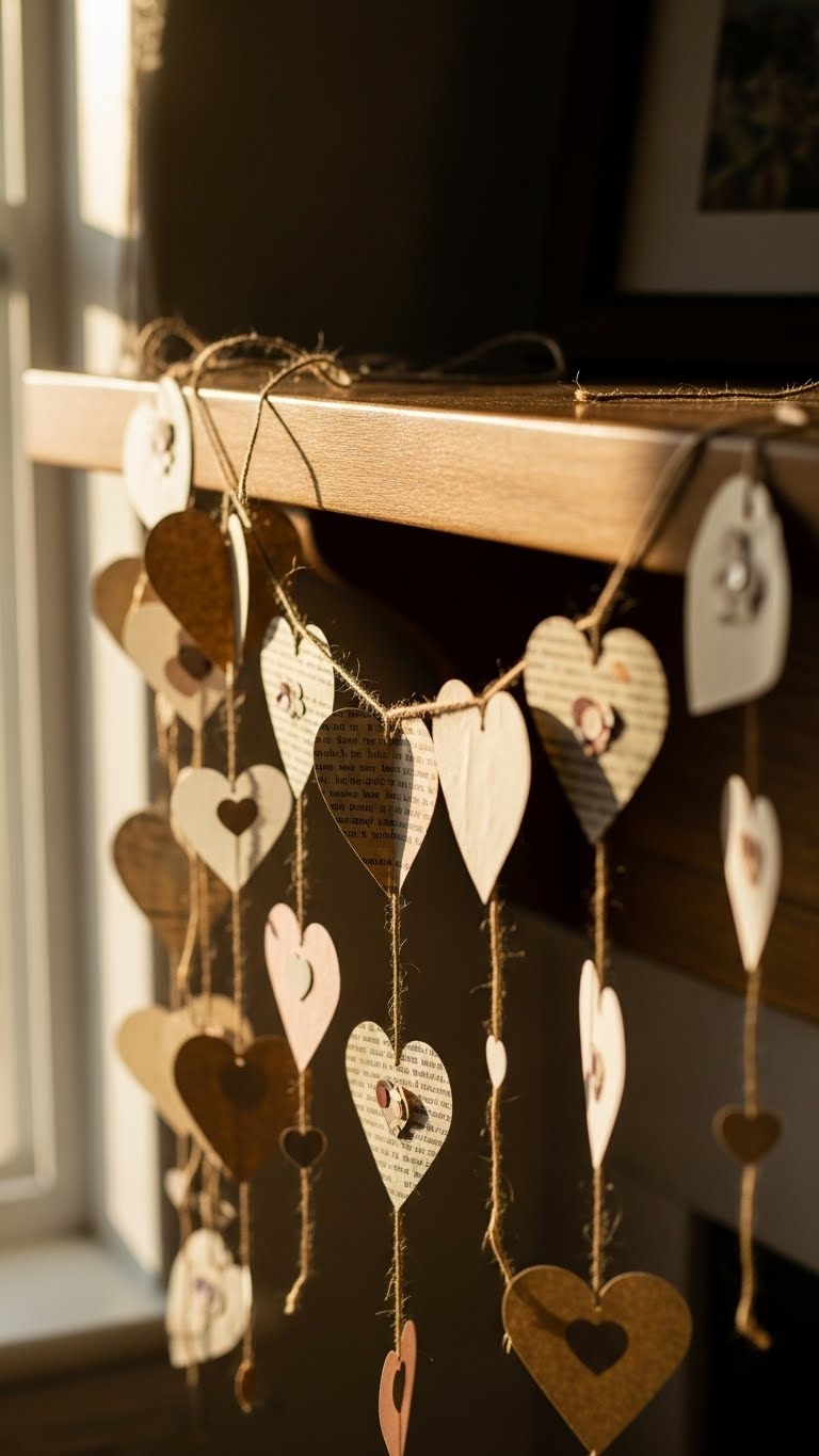 Start by cutting simple heart shapes from paper you love—think textured craft paper, faded book pages, or vellum—so you’ll have a mix of weight and translucence that catches light differently. Thread hearts onto rustic twine, alternating sizes and spacing for rhythm. Add small confetti hearts between larger pieces for sparkle. Hang loosely over mantels or shelves so the garland drifts and breathes.