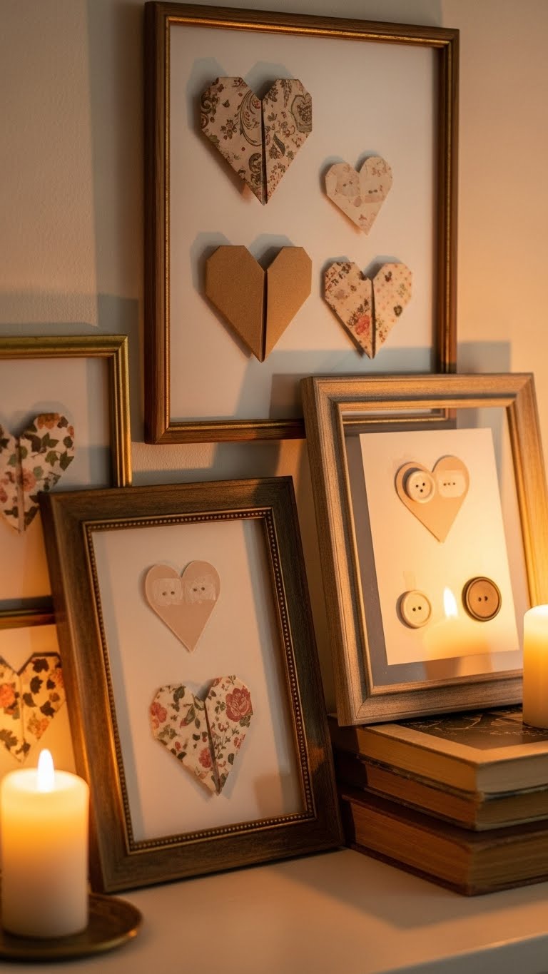 Create a cozy focal point on your mantel with framed paper hearts that look intentional but won’t break the bank. Pick varied paper textures and fold tiny origami hearts, or glue flat button hearts onto cardstock for contrast. Arrange them in mismatched frames, lean one against a stack of books, and let soft candlelight highlight the handmade shapes—simple, freeing, and warmly curated.