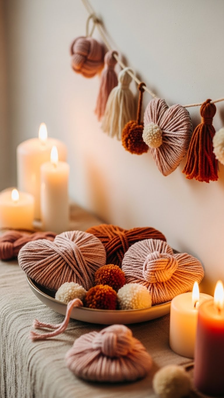 Once your mantel has that framed-heart charm, bring in softer, tactile pieces by making yarn hearts and tiny handmade accents that echo the same warm palette.