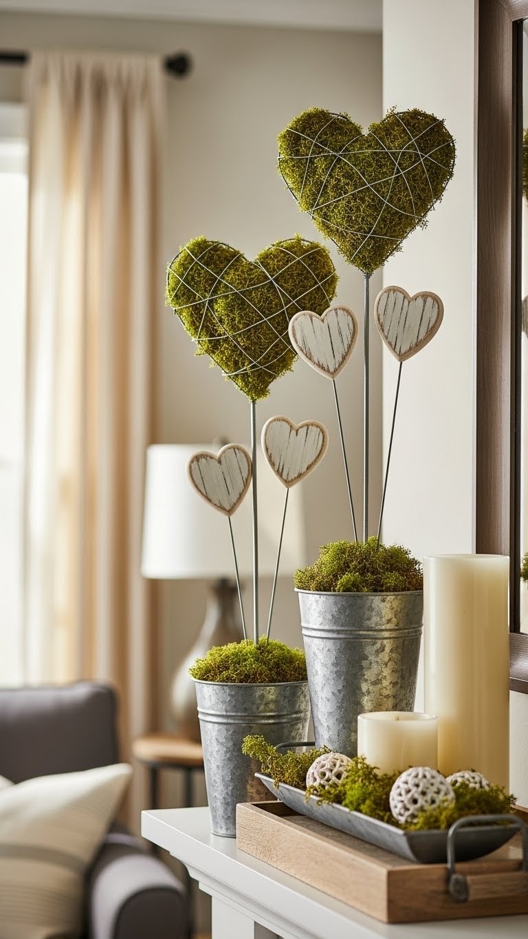 While you’ve been softening the mantel with wrapped hearts and tassels, add height and whimsy with heart topiaries that draw the eye upward and anchor your vignette. You’ll craft a simple diy topiary using wire frames, preserved moss, and painted hearts.
