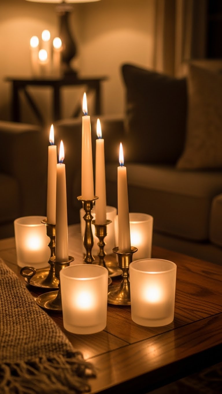When you dim the overhead lights and group a few tapered candles with clustered votives, the room instantly feels smaller and more intimate. You’ll place votives in frosted glass, mix tall tapers and low flames, and choose scented blends that whisper, not shout.