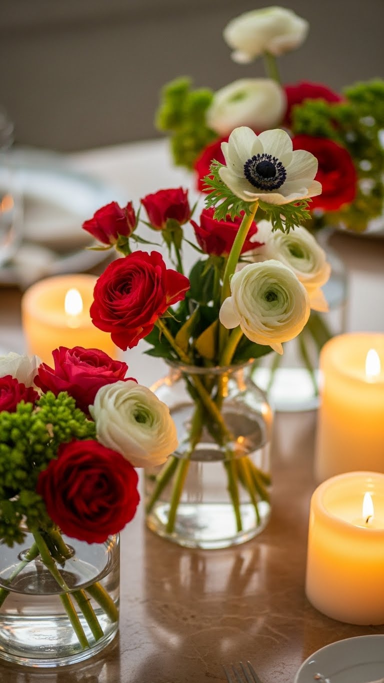 After the warm glow of pillar candles, a cluster of small red-and-white bouquets brings a fresh, romantic punctuation to your table.