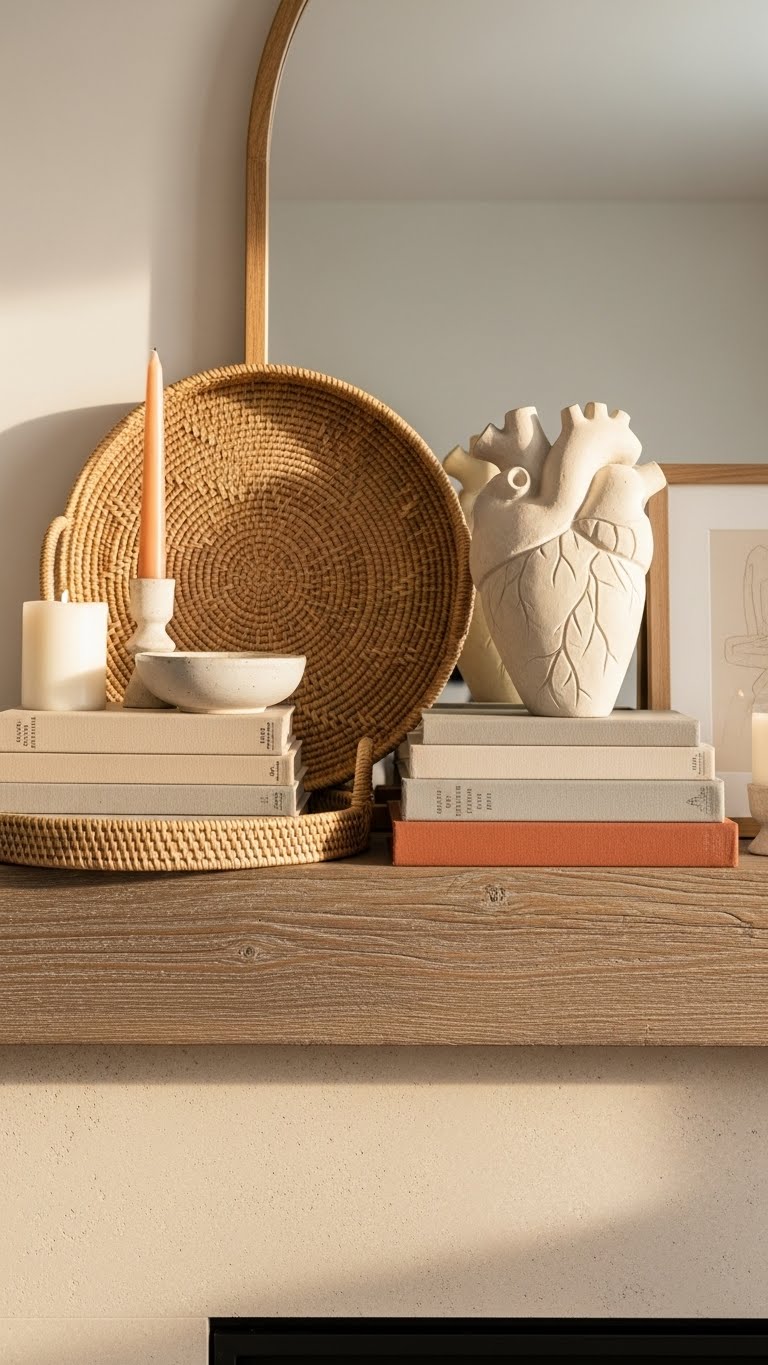 Layered Mantel Styling: Trays, Books, and Statement Hearts