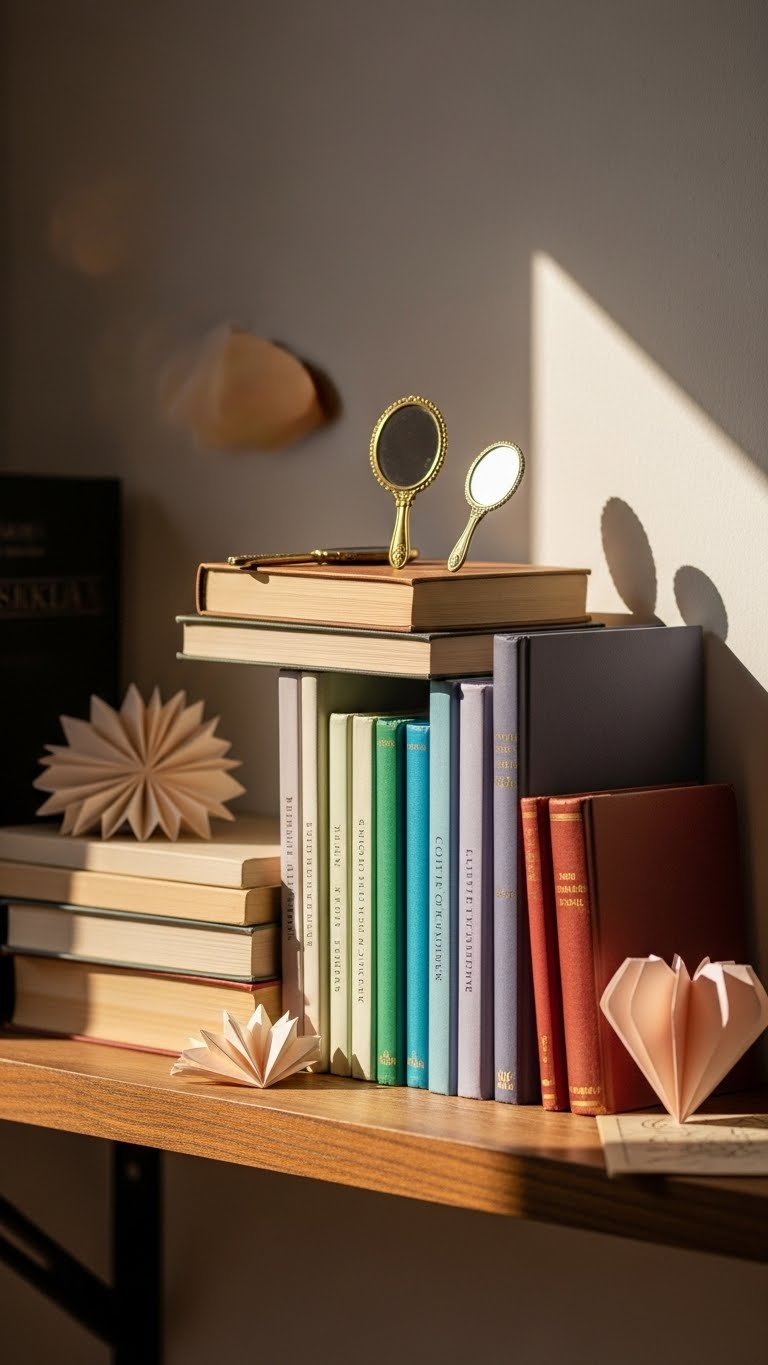 Shelf Vignettes: Stacked Books, Mirrors, and Paper Art
