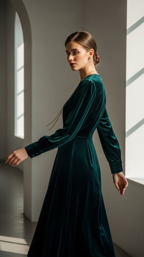 You’ll choose clean lines, a rich hue, and jewel minimalism—think a slim chain or studs—that keeps movement free. Care’s simple: follow velvet maintenance tips, steam gently and store flat.