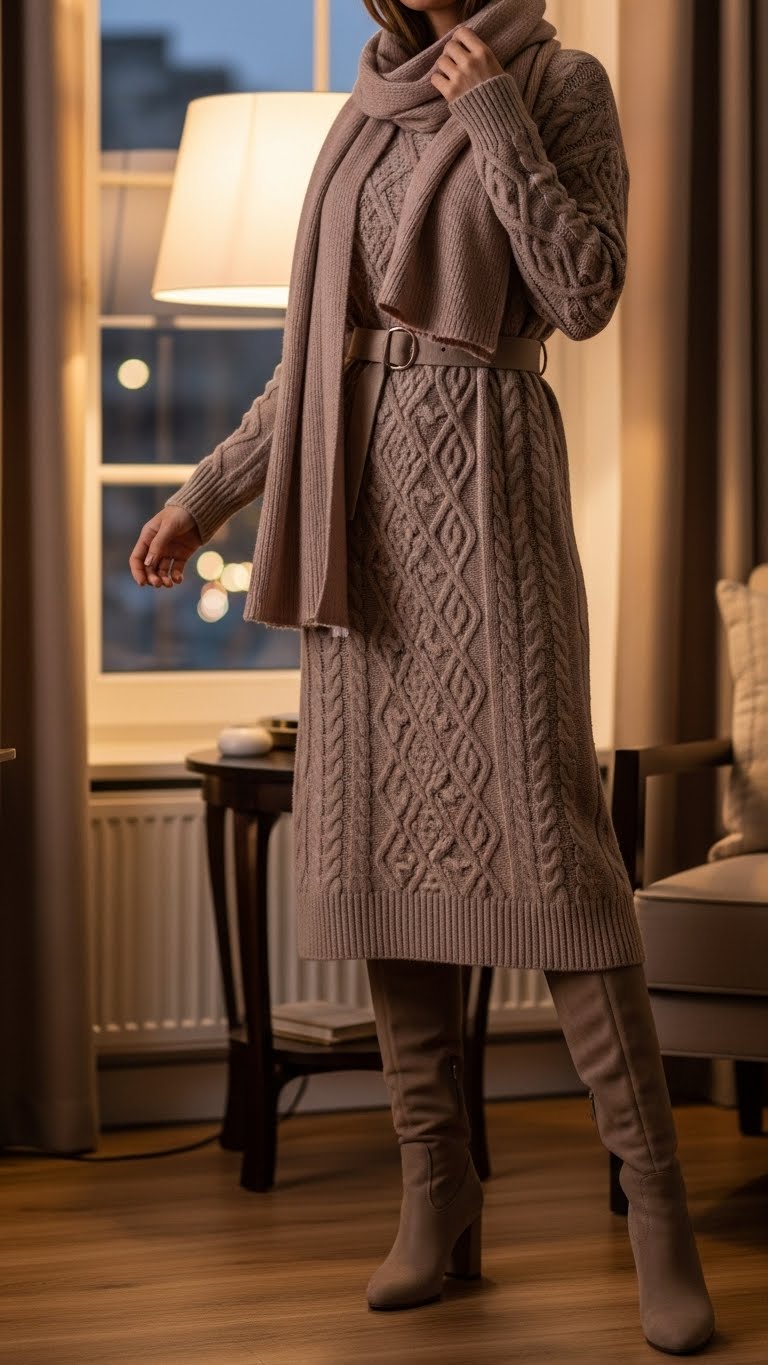 Choose a cable knit midi, add neutral boots and a belted silhouette to define your waist without fuss. Throw on a soft scarf for texture and movement, and you’ll feel free, polished, and ready for the evening.