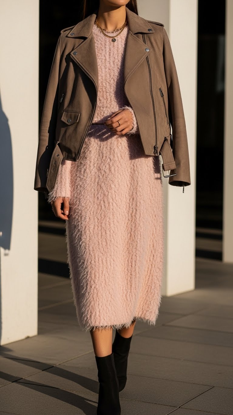 Sink into a fuzzy pink dress and you’ll immediately balance playful romance with modern edge by topping it with a structured suede jacket.