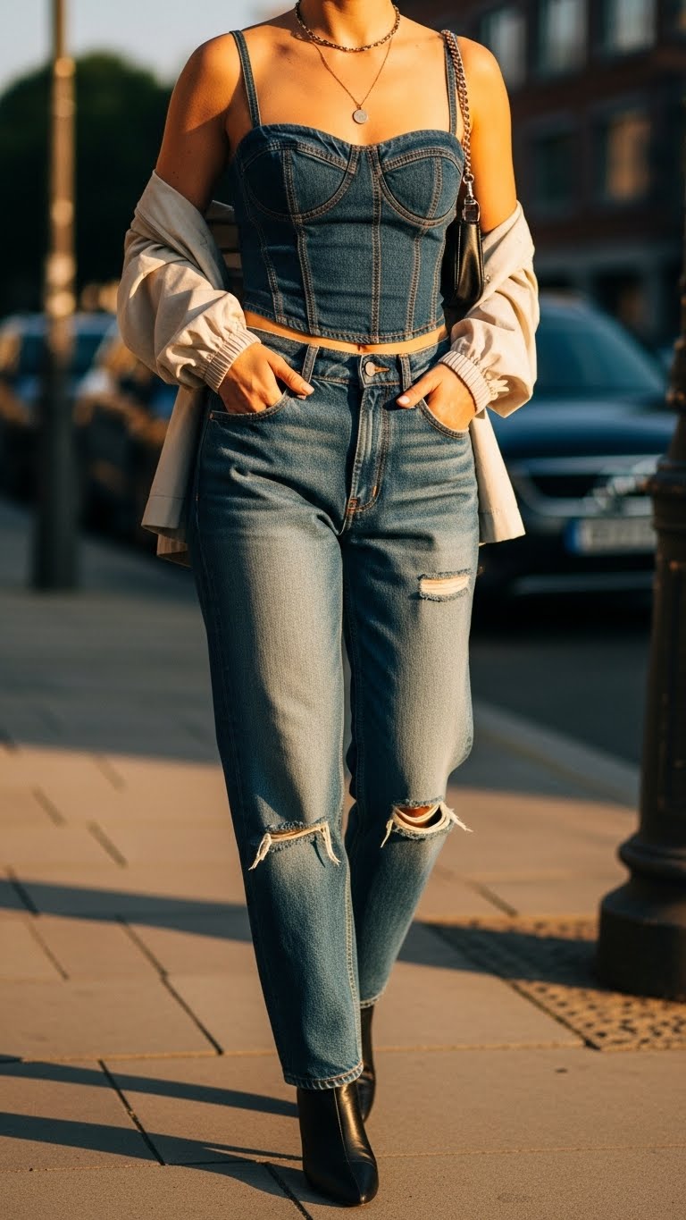 You’ll balance a denim bustier’s structure with relaxed jeans, styling a casual contrast through minimal jewelry, sleek boots, and a lightweight jacket. Move freely, keep proportions sharp, and own the understated confidence.