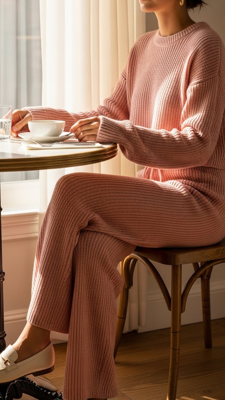 If you want to shift from cozy-chic to something sharper for a night out, swap the cashmere set for a cropped tee, an oversized blazer, and dark denim—an easy way to keep comfort while dialing up polish.