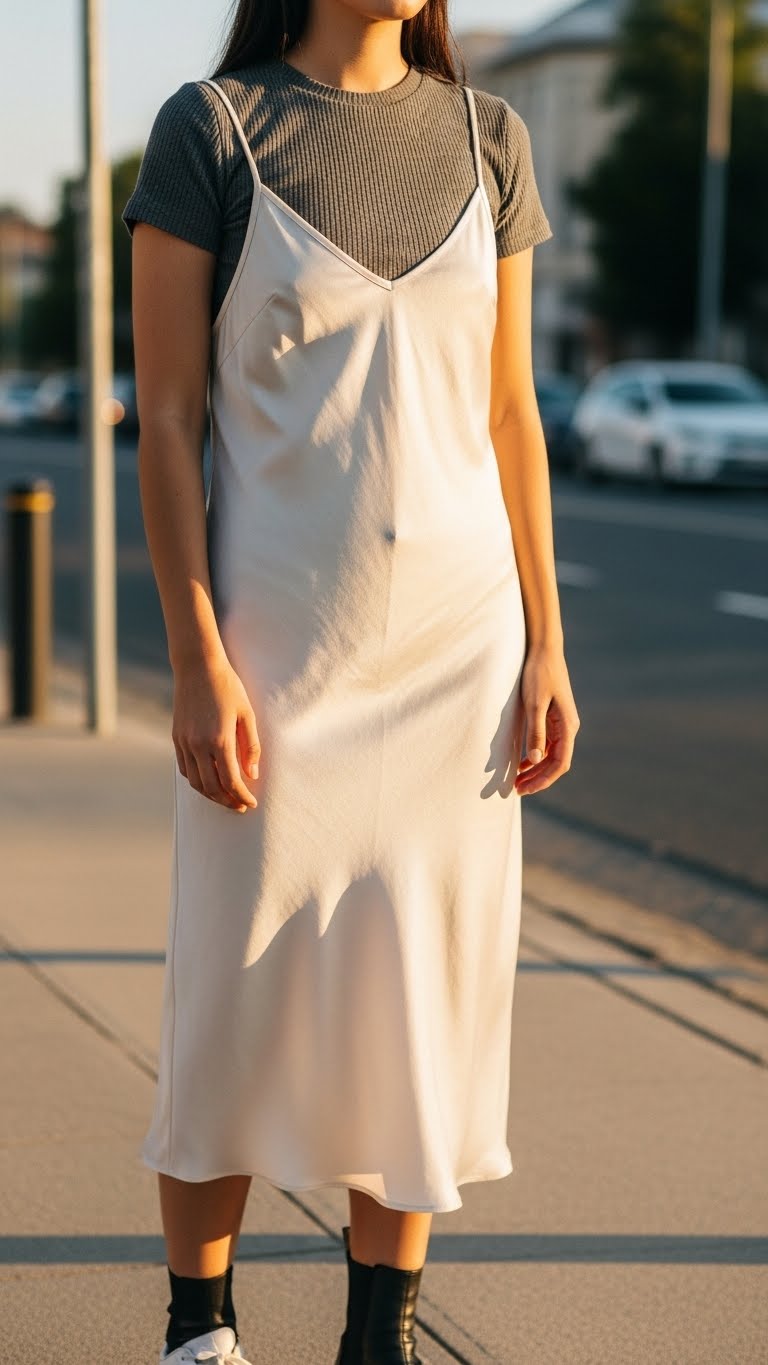 You’ll play with tee textures to contrast silky slip fabric, minding layer proportions so the tee’s sleeve and hem balance the dress. Finish with minimal sneakers or boots for independent, unfussy style.