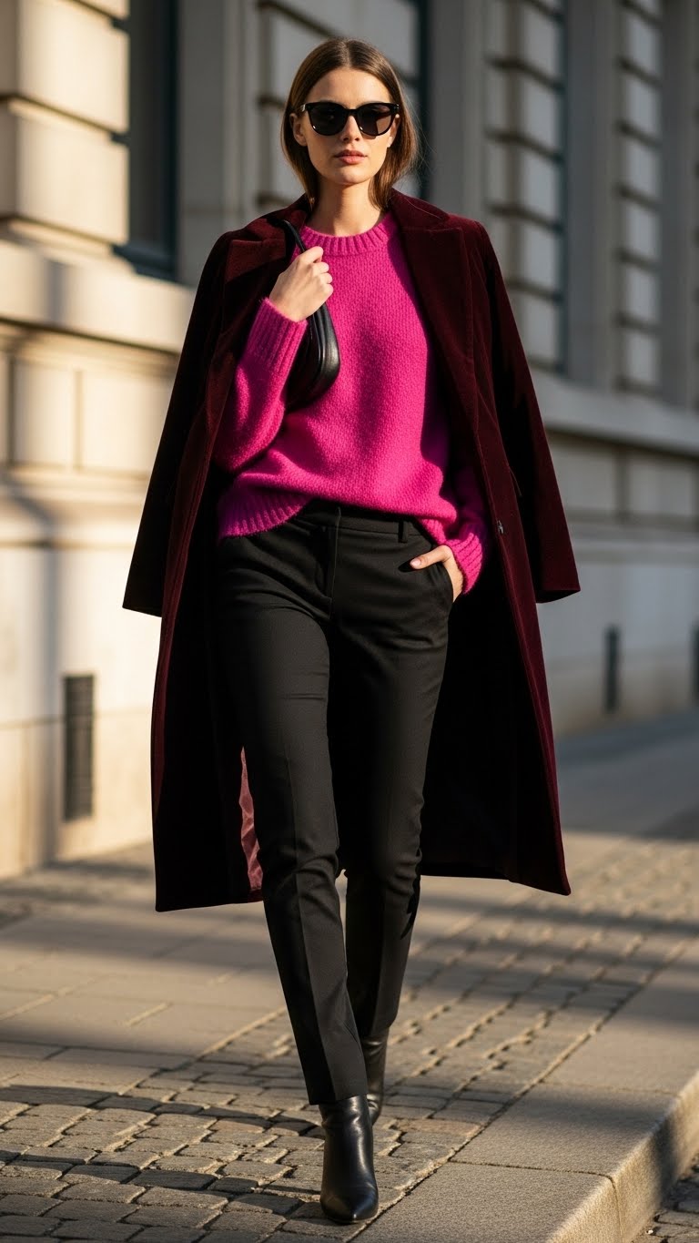 You’ll love how burgundy textures ground the look while a bright pink pairing keeps it lively. Slip into slim trousers and minimal boots, loosen a few layers, and move freely — confident, chic, and effortlessly composed.