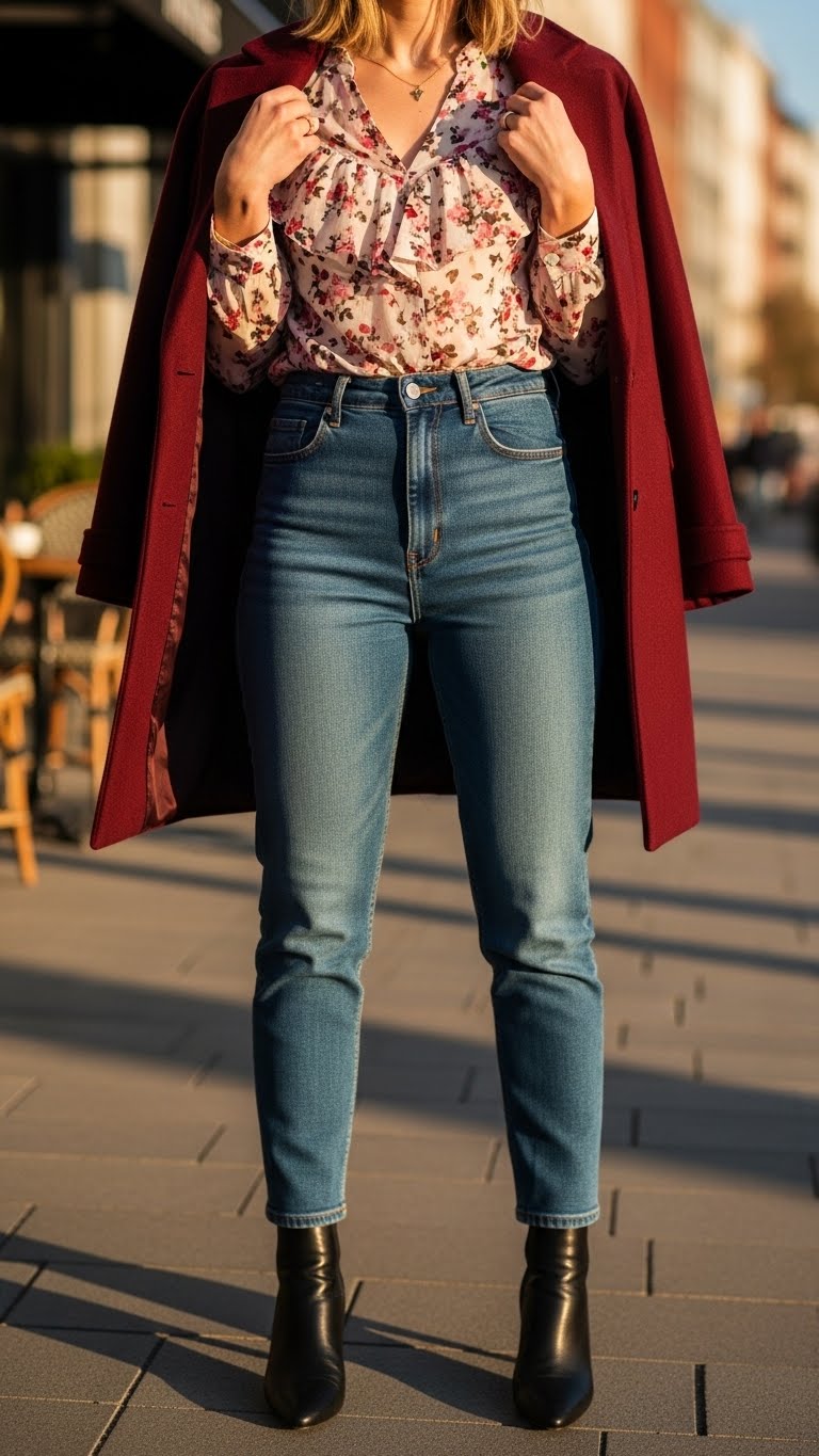 Keep the polished energy of that burgundy coat-and-pink sweater combo but swap in high-waisted jeans for a more relaxed, wearable take on romance.