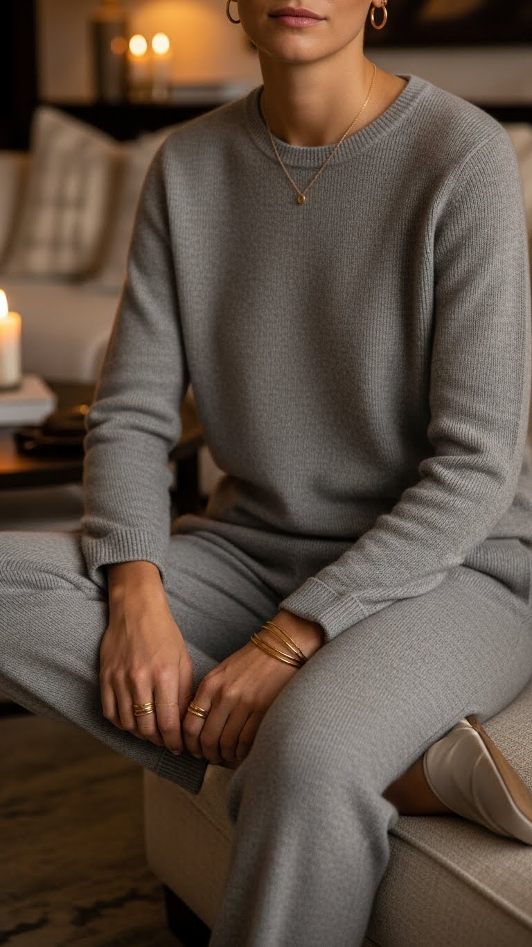 In a polished twist on cozy, slip into a matching loungewear set—think soft cashmere or fine-knit rib—in a neutral or muted jewel tone, then anchor it with delicate gold jewelry to instantly up the polish. You’ll pair gold hoops with minimal rings, tuck hems to show satin slippers, and keep silhouette clean—effortless, confident, and free to move through the evening.