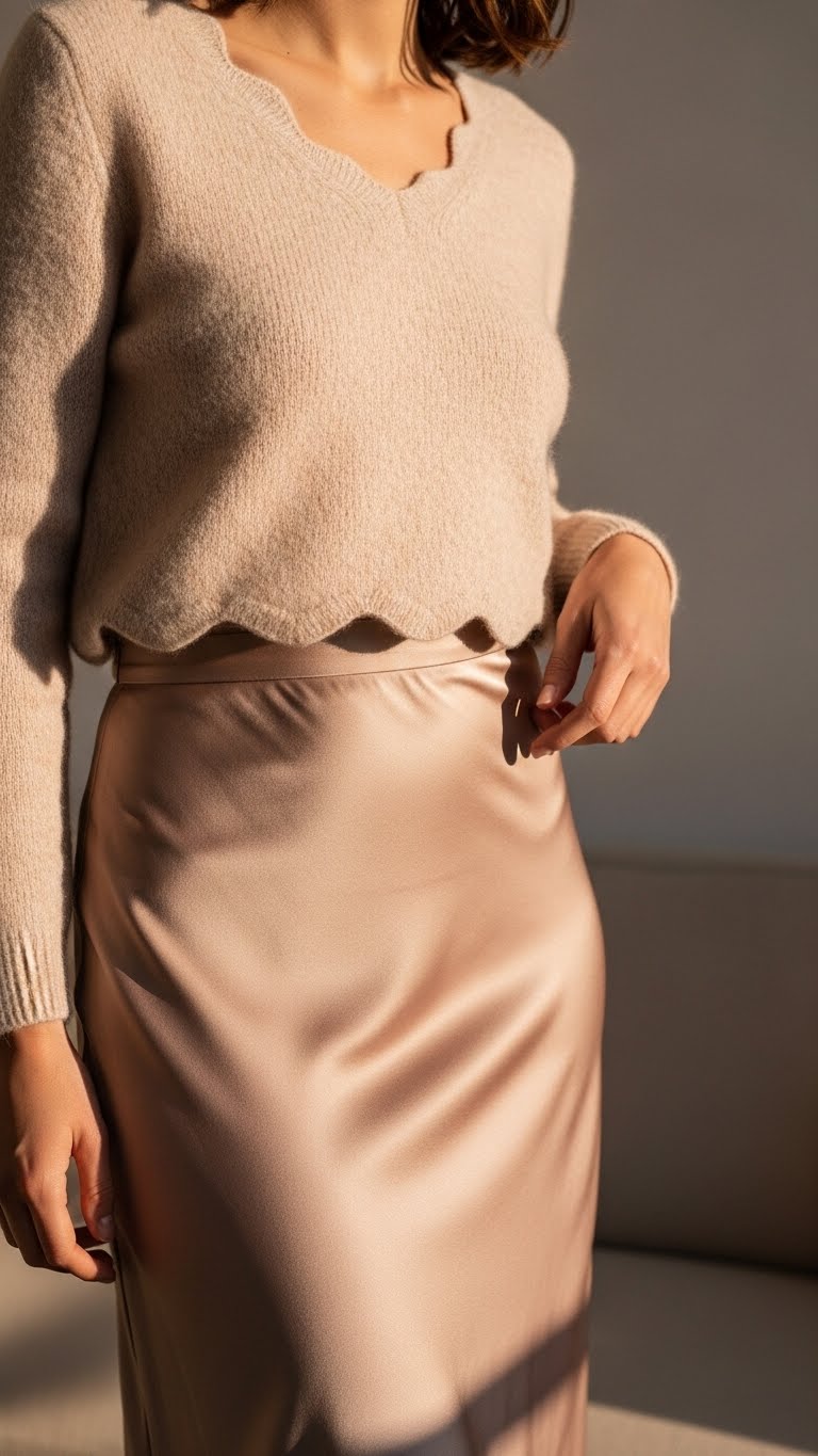 You’ll lean into a scalloped sweater silhouette and play with midi skirt textures, choosing soft knits or satin to move freely.