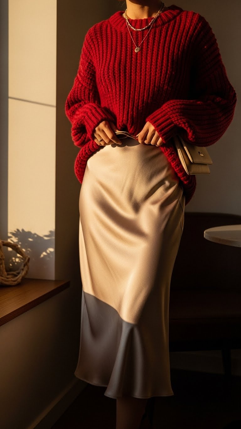 You’ll lean into satin drape that flatters movement while a cozy, oversized sweater adds chunky texture and balance.