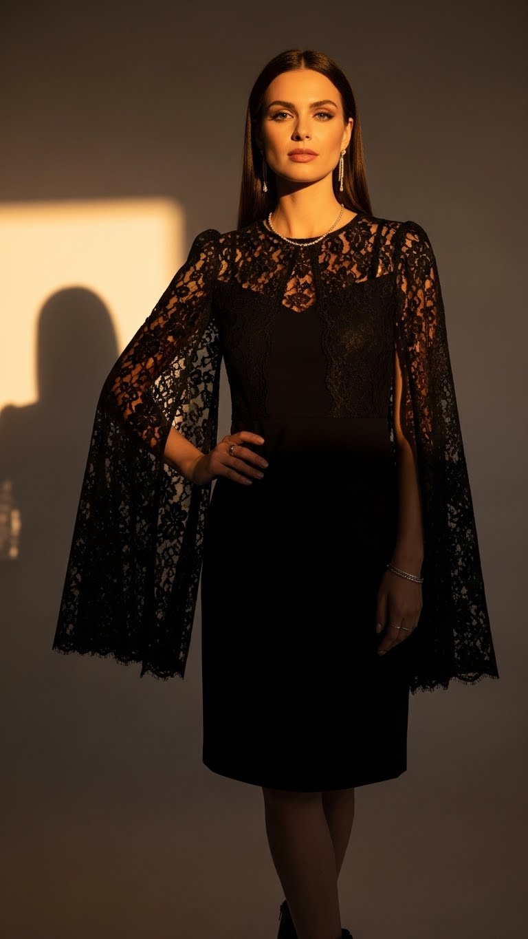 If you loved the cozy-elegant contrast of satin and knit, shift toward a more classic, femme moment with a little black dress featuring lace overlay or dramatic cape sleeves. You’ll embrace lace detailing that hints at romance without confinement, while cape drama gives movement and confidence.