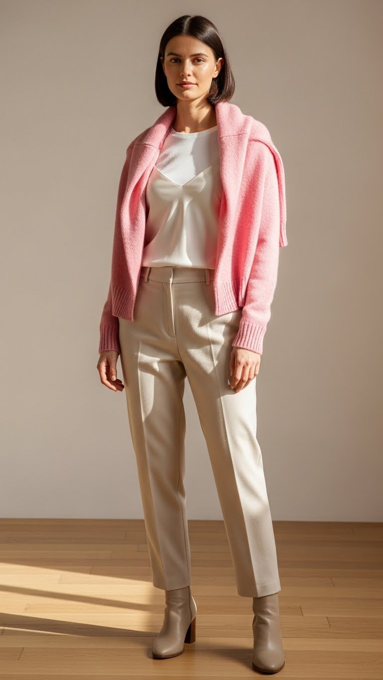 A soft pink cardigan instantly lifts a Valentine outfit with approachable, modern romance; layer it over a simple tee or silk camisole and let the pastel read fresh against neutral boots for grounded polish.