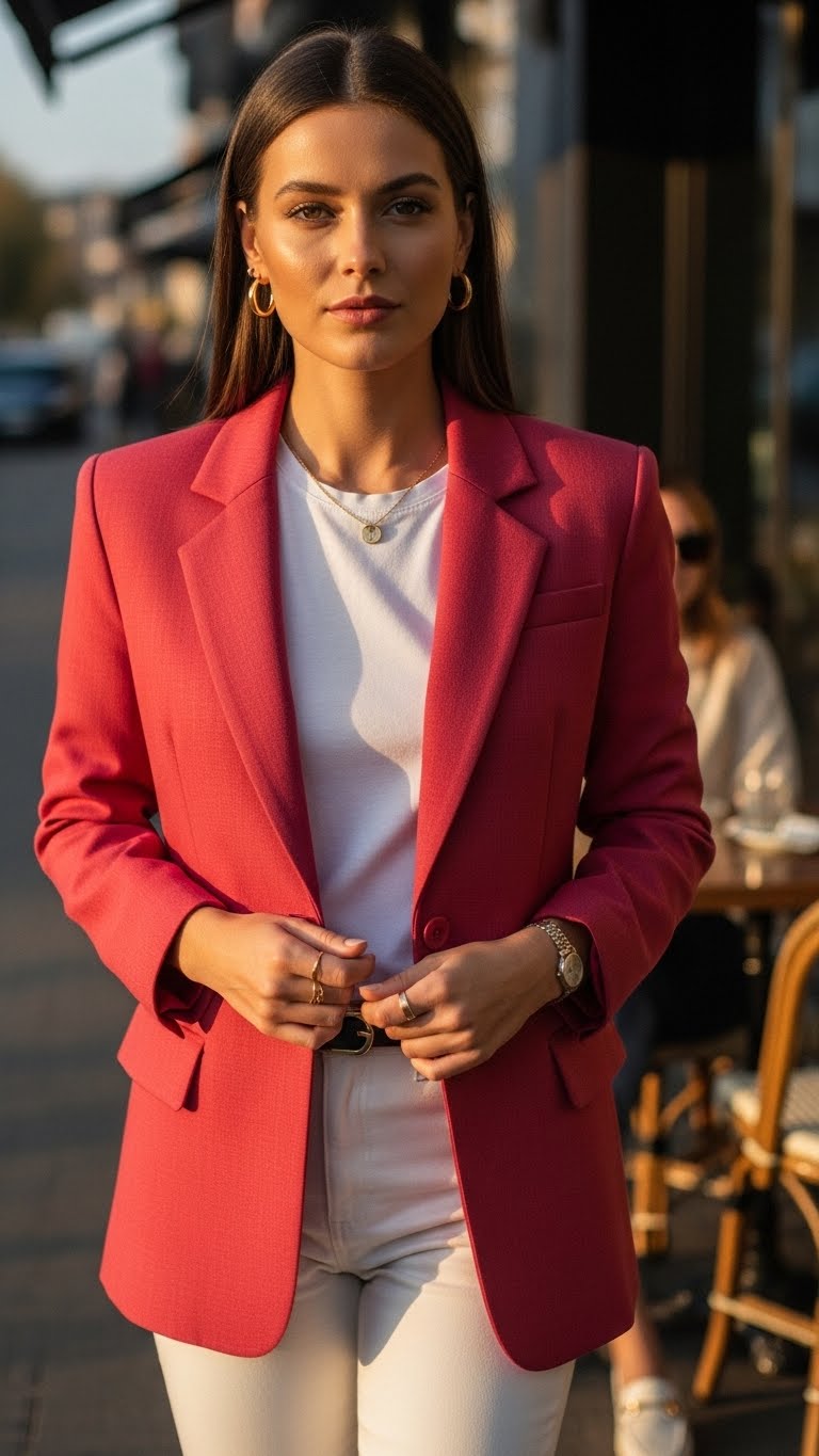 Tap into instant polish with a statement blazer in pink or red layered over a simple tee — it elevates casual basics into a confident, date-ready look.