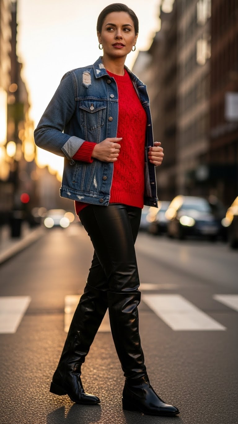 Turn up the cozy factor by layering a classic denim jacket over a vivid red sweater and finishing the look with sleek leather boots, a trio that balances edge with warmth for a confident, city-ready outfit. You’ll embrace denim revival with purposeful distressing, highlight sweater texture and red accents, and keep it polished—maintain boot polish and effortless attitude for a liberated, modern vibe.