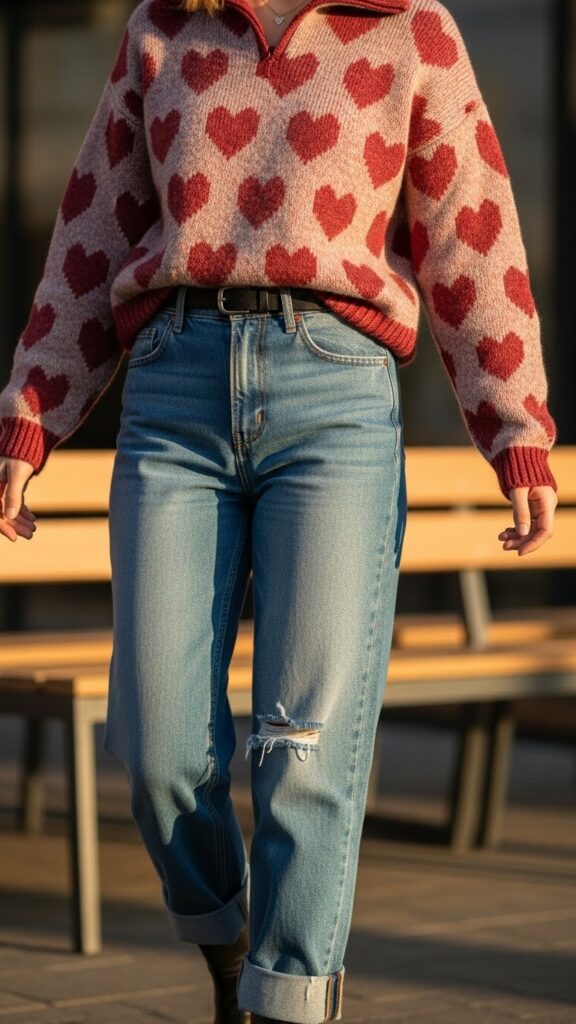 Turn up the charm with a heart-print pullover paired with relaxed jeans for a look that’s playfully warm and effortlessly wearable.