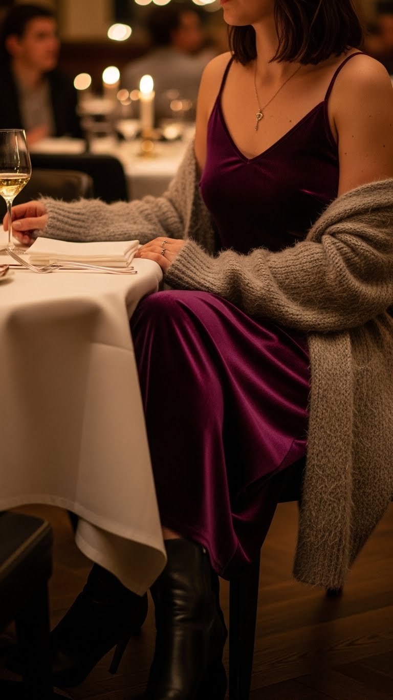 Slip into a deep-plum velvet slip and layer a fuzzy cardigan over your shoulders to balance sultry sheen with tactile coziness—velvet reads romantic and luxe under dim restaurant light, while the soft, fuzzy knit keeps the look approachable and warm for lingering conversations. You’ll play with velvet textures and fuzzy layering, choosing slim heels or boots and minimal jewelry to stay effortlessly free.