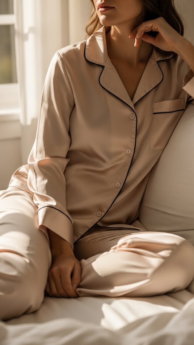Button up a silky pajama set and you’ll instantly telegraph relaxed luxury—think satiny sheen catching soft morning light, contrast piping framing your silhouette, and a loose-fit trouser that drapes like a warm exhale.