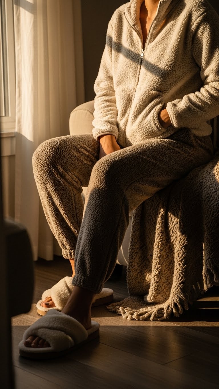 After a silky pajama set, swap into sherpa for cozy-casual photos that feel lived-in and luxe. You’ll pull on a cozy sherpa zip-up, ease into plush joggers, and slide into oversized plush slippers.