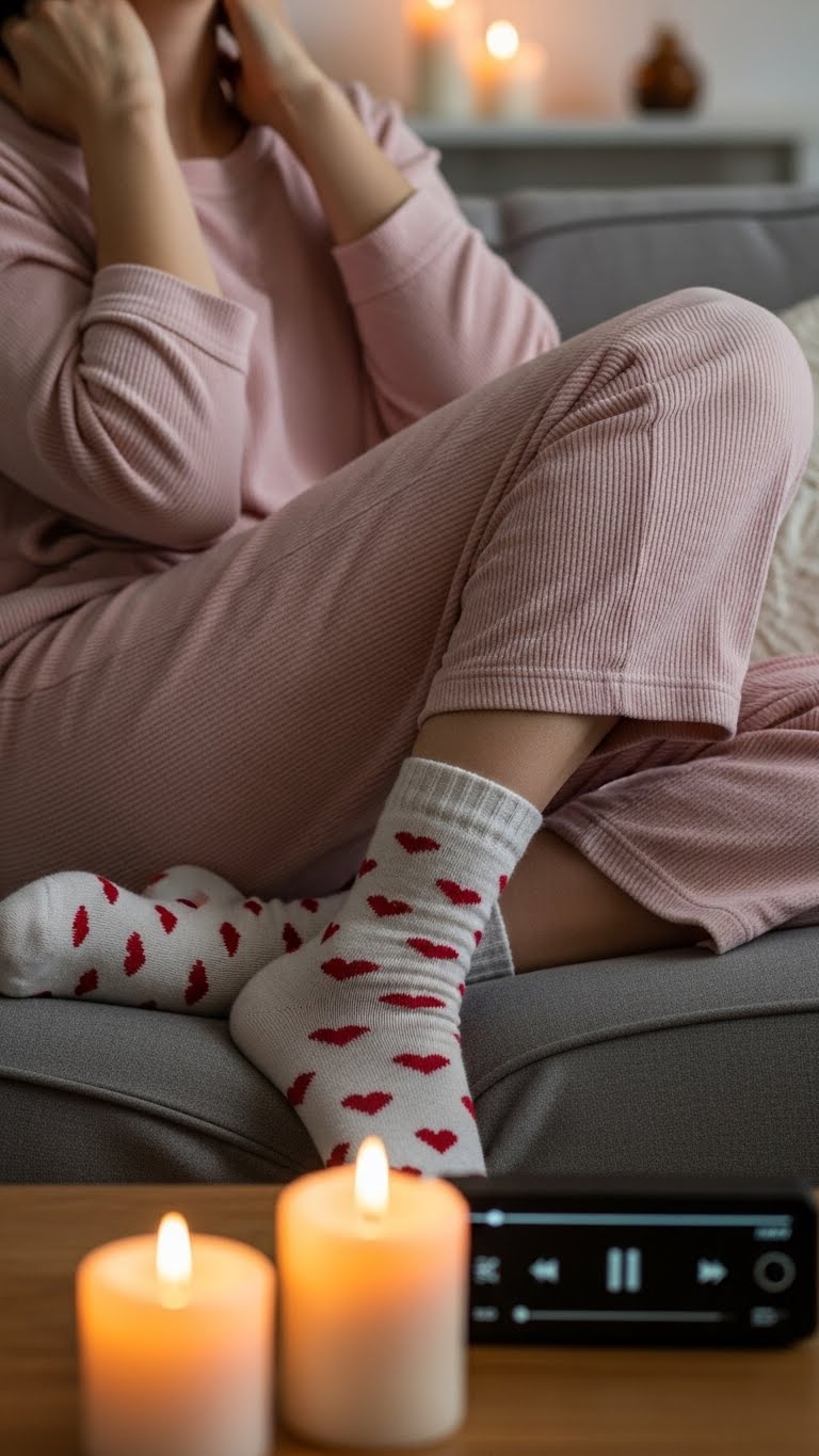 When your game-night layers come off and the evening turns inward, slip into a lounge romper and heart socks to keep the mood snug and self-directed. You’ll feel soft fabric hug your skin, warm socks grounding toes.