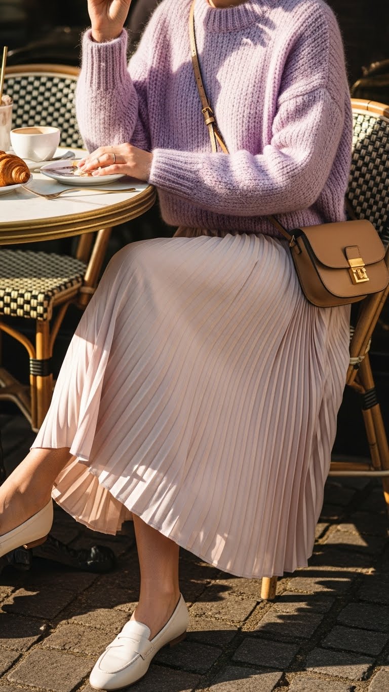 Beneath soft morning light, a lilac knit sweater and a pleated skirt make brunch feel both fresh and refined—your sweater’s fuzzy yarn warming your shoulders while the skirt’s knife pleats sway with each step.
