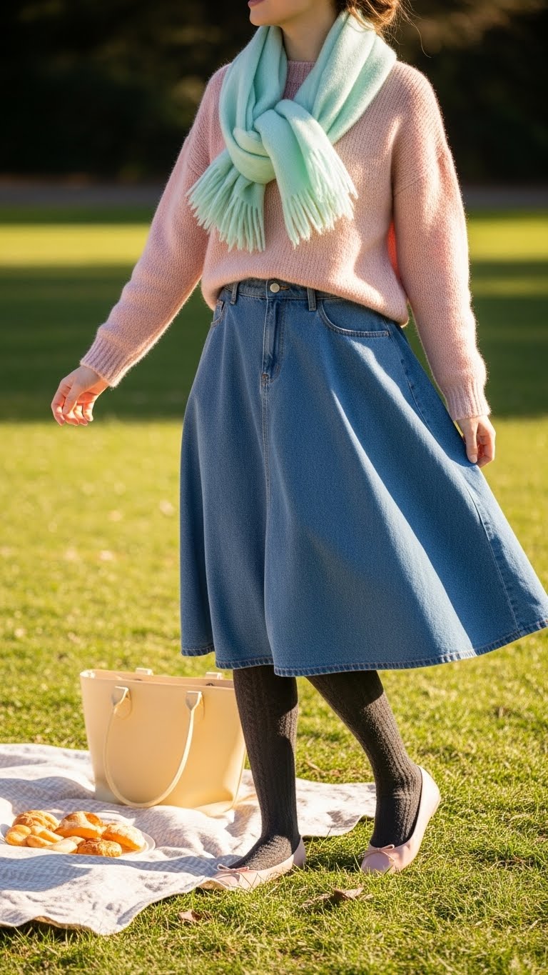 You’ll pair it with a denim skirt that moves when you do, pastel accessories that whisper charm, and textured tights for cozy contrast. Keep silhouettes unfussy, fabrics soft, and let playful layers give you freedom to roam and feel buoyant all day.