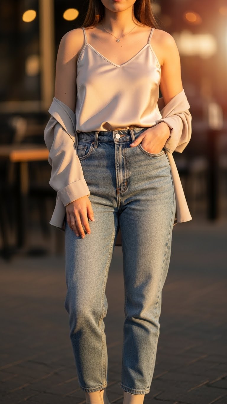 Cozy Satin Top + High-Waist Jeans for Casual Dates