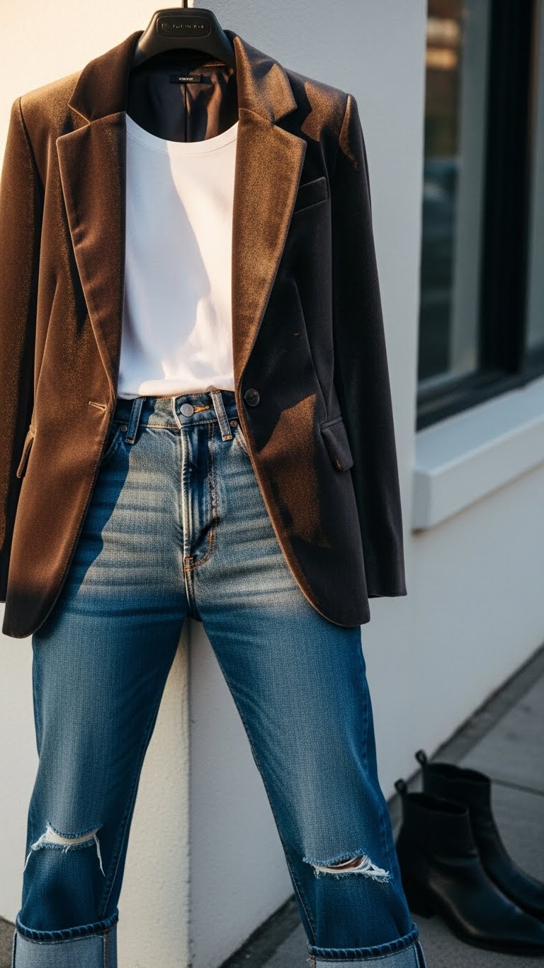 Pairing a plush velvet blazer with a simple tee and your favorite jeans instantly elevates a casual look to quietly luxurious — you get rich texture against soft cotton and lived-in denim that reads polished without trying too hard.