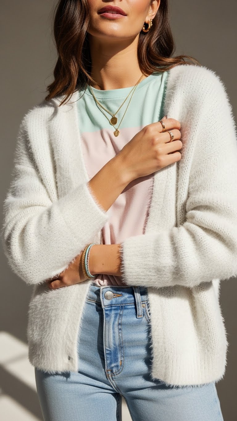 Fuzzy White Cardigan + Pastel Tee for Feminine Vibes