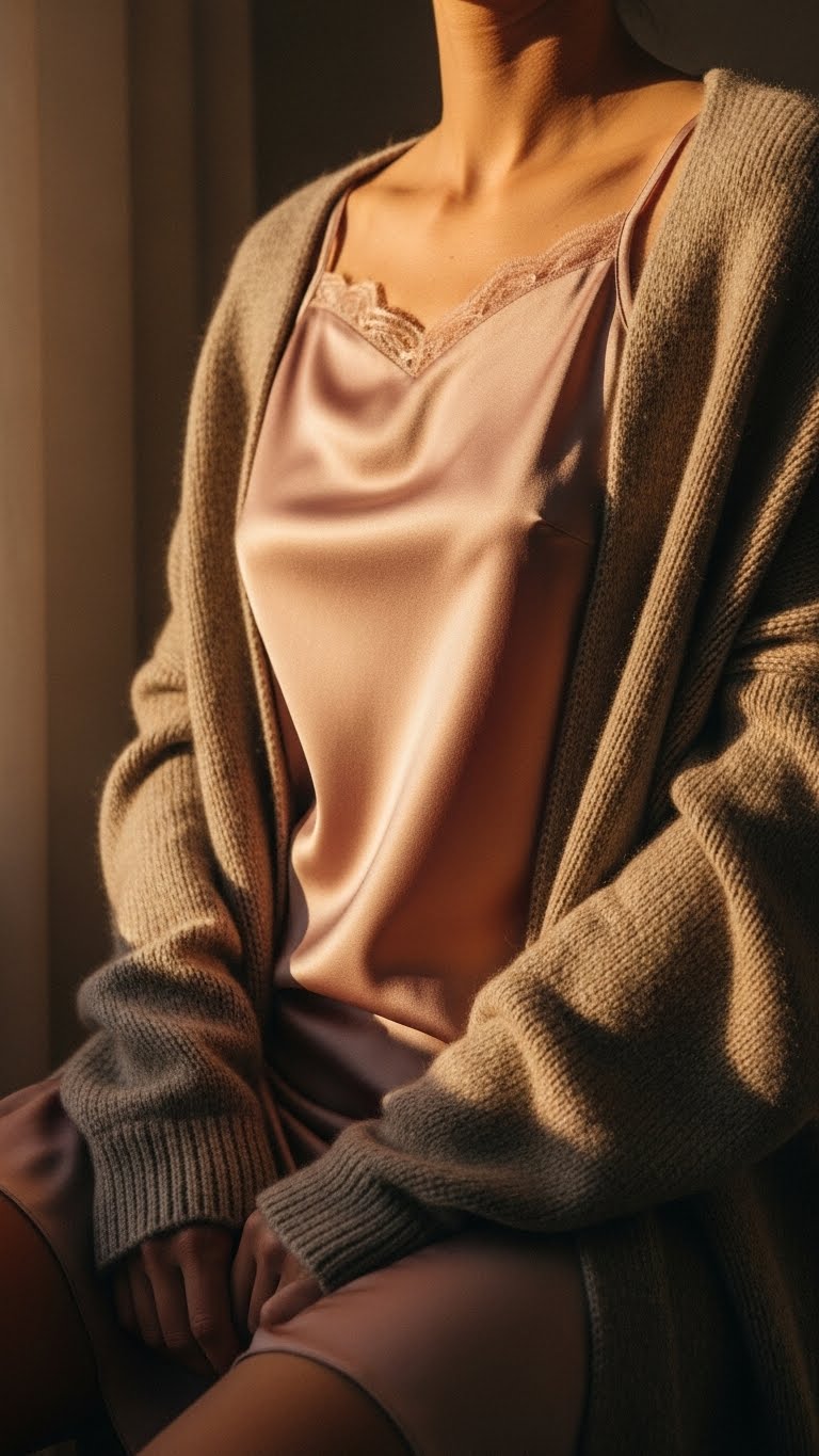 Layered Silk + Satin Camis Under a Loose Cardigan